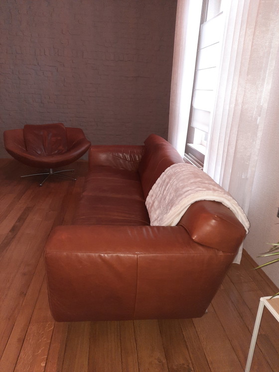 Mooie 3-zits lederen designbank Santiago van het Nederlandse merk Label. Brede poten in rvs.