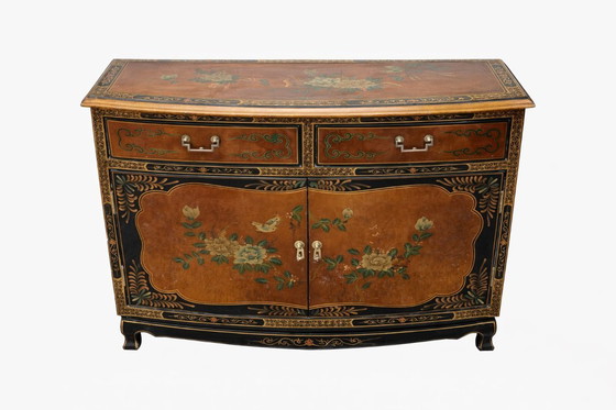 Entdecken Sie dieses lackierte Sideboard mit asiatischem Flair – ein Schmuckstück, das Ihrem Zuhause Eleganz und Raffinesse verleiht. Sein einzigartiges Design, verziert mit zart gemalten Blumen- und Vogelmotiven, erinnert an traditionelle asiatische Kunst und macht dieses Möbelstück zu einem wahren Kunstwerk.
