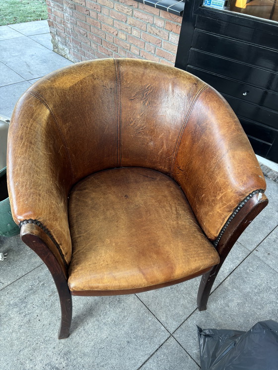 Siehe Fotos für einige Farbspritzer auf dem Leder. Der Sessel weist Gebrauchsspuren auf, was angesichts seines Alters jedoch nicht ungewöhnlich ist.