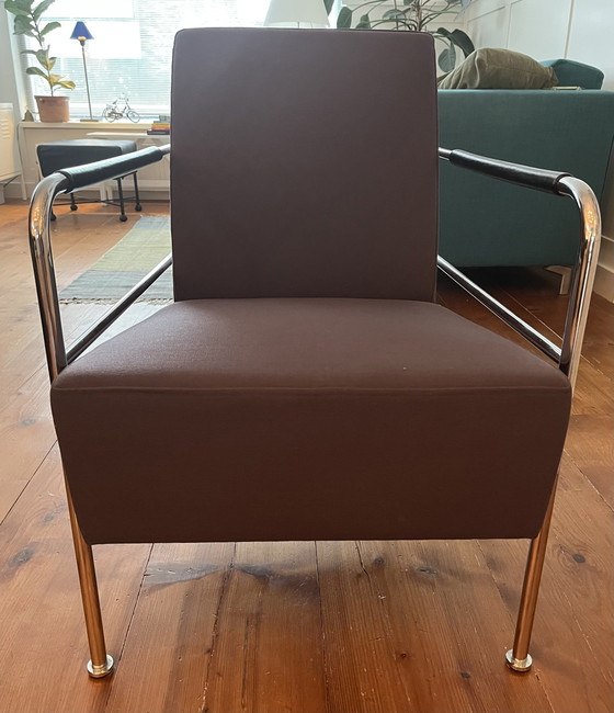 Kino-Sessel. Strakke design stoel in uitstekende staat. Bekleding grijze stof. Verchromtes Gestell mit Armlehnenbezügen aus Leder. Merk: Ammhults, Zweden. Aus den 90er Jahren stammend. Verfasser: Gunilla Allard. Der Sessel Cinema, der 1994 für Lammhults entworfen wurde und bei dem Details alter Sportwagen als Inspirationsquelle dienten, ist der bekannteste ihrer Entwürfe.