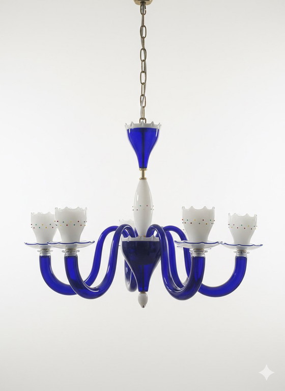 Lampadario de Majo Murano - Vetro Blu Cobalto e Lattimo - Firmato a Punta