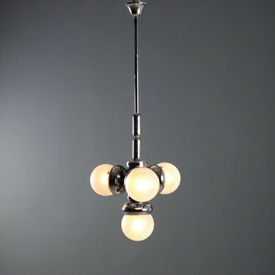 Vintage-Lampe aus Italien mit verchromtem Metallgestell und handgefertigten Glasdiffusoren. Artikelnummer: MOILIL0302493