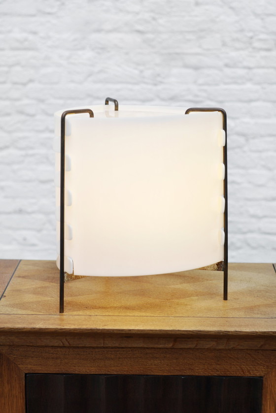 Diese seltene M8-Tischleuchte, die von Joseph-André Motte entworfen und 1958 von Les Huchers Minvielle in Frankreich hergestellt wurde, ist ein beeindruckendes Beispiel für die moderne französische Beleuchtung der Jahrhundertmitte. Das Gestell aus vernickeltem Messing mit elegant geschwungenen Linien und die drei skulpturalen, gebogenen Plexiglasschirme sind ein Beispiel für Mottes innovativen Umgang mit Materialien und Design. Literatur: Katalog von Huchers Minvielle, n.p. Clémence et Didier Krzentowski, The Complete Designers' Light II, Galerie Kreo Editions, Paris, 2014, S. 117 In gutem Zustand, voll funktionsfähig.