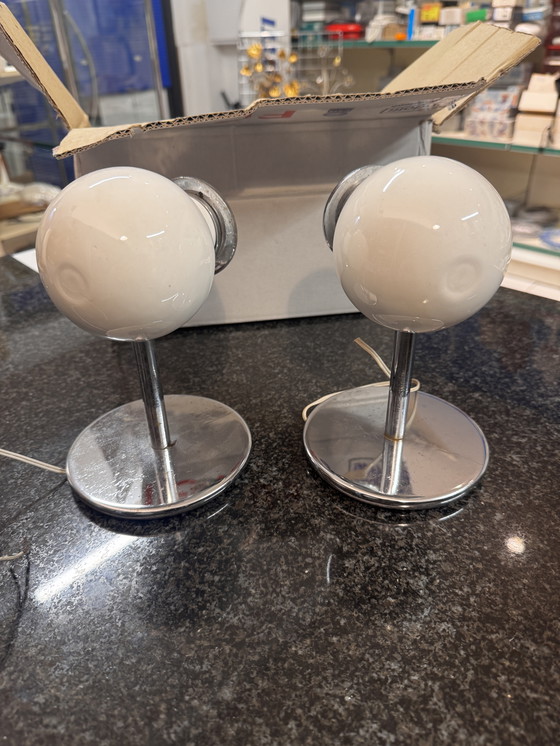 Zwei Vintage-Lampen im „Space Age“-Stil der 1960er/1970er Jahre. Der weiß lackierte Metallschirm mit dem robusten Chromfuß vereint Stil und Funktionalität. Verleihen Sie Ihrem Zuhause mit diesen vielseitigen Lampen einen Hauch moderner Eleganz. E27-Fassung