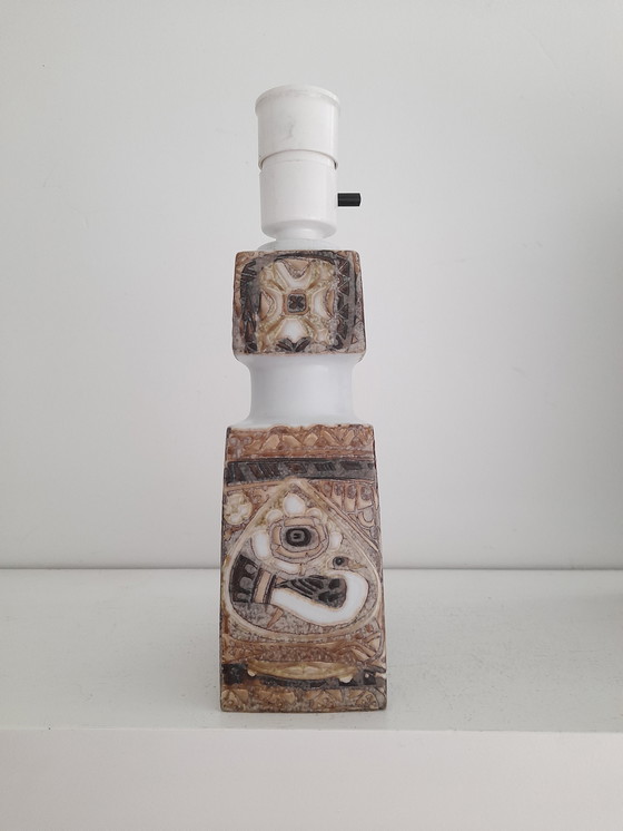 Wunderschöner Keramik-Lampensockel der Kopenhagener Leuchtenmarke Fog & Mørup. Eine unverwechselbare, mosaikinspirierte Technik. Die Hauptoberfläche zeigt eine stilisierte Taube in Beige-/Brauntönen. Vintage-Elektroanschluss (1960er Jahre). Auf dem Sockel gestempelt.