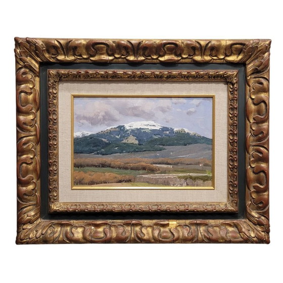 Ein wunderbares Ölgemälde auf Leinwand, „Landschaft Miraflores de la Sierra, Madrid“, von Juan Francisco Toro de Juanas. Dieses kleinformatige Werk zeigt eine wunderschöne und friedvolle Berglandschaft im charakteristischen realistischen Stil des Künstlers. Das Gemälde wirkt wie ein kleines Fenster zur Außenwelt und bietet einen Blick auf den schneebedeckten Gipfel und die bewaldeten Hänge. Vor einem Hintergrund, der von meisterhafter, intensiver und tiefgründiger Zeichnung zeugt, wird das Werk durch eine ruhige und ausgewogene Farbpalette bereichert, die die Realität in ihrer ganzen Tiefe einzufangen sucht. Eingefasst in einen wunderschönen, geschnitzten und vergoldeten Holzrahmen im Barockstil mit reichem Rankenwerk, ist das Gemälde durch einen Doppelrahmen und ein elegantes, sandfarbenes Leinenpassepartout von der Leinwand getrennt.