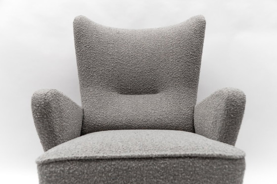 Erleben Sie den Charme der 1950er Jahre mit diesem beeindruckenden großen Wingback-Sessel aus Italien. Der Sessel ist mit einem eleganten grauen Bouclé-Stoff bezogen, der sowohl Komfort als auch Stil bietet. Die geschwungenen Linien und die hohe Rückenlehne verleihen diesem Möbelstück eine majestätische Präsenz, die in jedem Raum zum Blickfang wird.