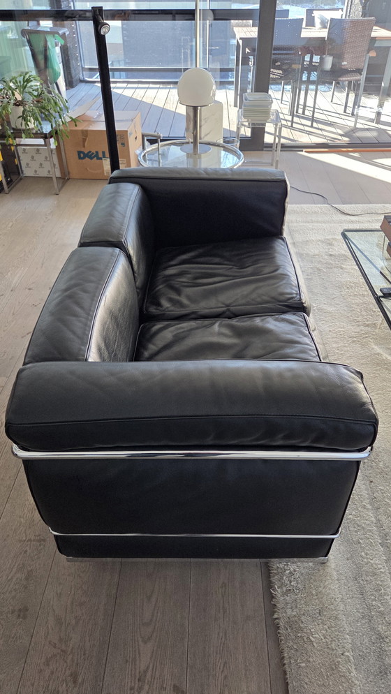 Erleben Sie die zeitlose Eleganz des Le Corbusier LC2 2-Sitzer-Sofas, ein Meisterwerk modernen Designs. Dieses ikonische Möbelstück, gefertigt aus luxuriösem schwarzem Leder und einem eleganten Metallrahmen, vereint Komfort und Raffinesse. Seine minimalistische Ästhetik und die klaren Linien machen es zur perfekten Ergänzung für jedes moderne Wohnzimmer.