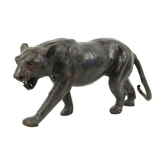 Schöne und seltene Mid Century Pantherstatue aus Pappmaché, mit Stroh gefüllt und mit schwarzem Leder überzogen, gelbe Glasaugen und weiße Kunststoffzähne, ganz im Stil von Liberty of London, um 1950. Diese Statue hat sehr schöne Proportionen und Details, die Muskeln sind schön und genau wiedergegeben, typisch sind die gelben Glasaugen, die Schnurrhaare fehlen, das Ganze trägt eine sehr schöne Alterspatina. Liberty of London brachte in den 1950er Jahren mehrere Ledertiere in verschiedenen Größen heraus, darunter Giraffen, Elefanten, Löwen, Panther, Nashörner, Nilpferde, Dromedare und viele andere Arten. Diese fantastischen Figuren haben einen hohen Sammlerwert und sind sehr begehrt. Dieser Panther ist in einem guten Vintage-Zustand, mit altersgemäßen Gebrauchsspuren, siehe Fotos für weitere Details! Abmessungen: 43x10x18cm. Gewicht: 0,727 kg.