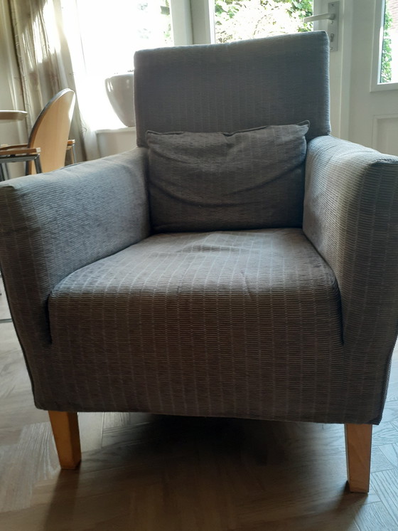 Massiver Korpus mit festem Textilbezug in Mischfarbe. Grau-brauner Farbton. Beine aus Buche, Rückenlehne mit Reißverschluss