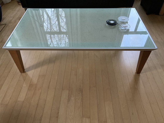 Leolux Couchtisch mit eingelegter Glasplatte im Metallrand. Holzbeine verjüngt. Schönes marmoriertes Glas ohne Beschädigung. Glasplatte kann zum Reinigen aus dem Metallrand herausgehoben werden. Kleine Beschädigung an einem der Beine. Größe 140x80, Höhe 40 cm.