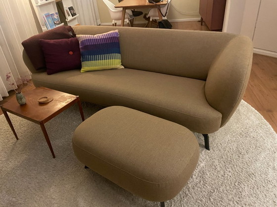 Ervaar de tijdloze elegantie van de Leolux Flint 3-zits bank, vergezeld door een bijpassende hocker, beide bekleed met de verfijnde Re-wool 458 stof; duurzame textielproducten van Kvadrat. Gemaakt met 45% gerecyclede wol
