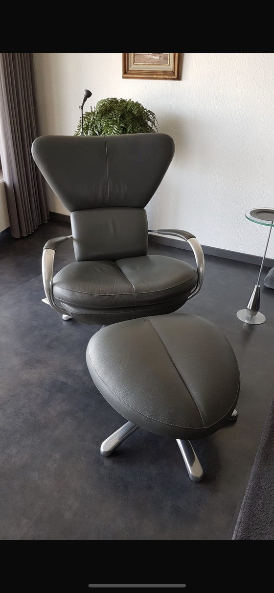 Dies ist ein Leolux Formi Sessel mit Ottomane, die beide aus hochwertigen Materialien bestehen. Die Polsterung ist ein schöner Grauton mit Aluminium-Stuhlbeinen. Sie sind schöne Versionen in sehr gutem Zustand.