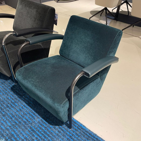 Leolux Scylla Sessel * Klassisches Design von Gerard Vollenbrock * Elegante Ausführung in Spazio Petrol Stoff * Modell mit niedriger Rückenlehne * Armlehnen aus Raffino Schildkrötenleder * Gestell: Epoxy Nuit Silk * Garn: Ton-in-Ton * Comfort Soft: für besonders weichen Sitzkomfort
