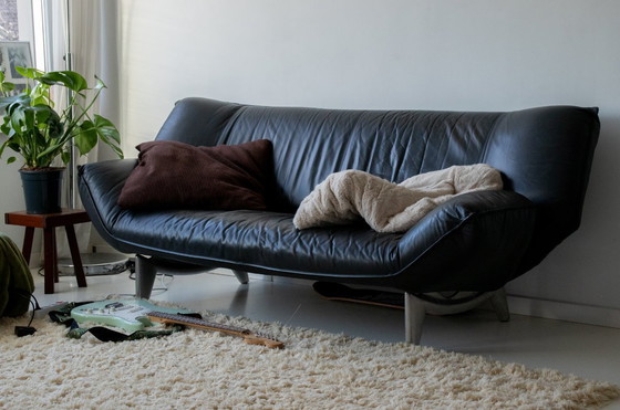 Wunderschönes schwarzes Ledersofa mit Chromdetails. Retro-futuristisches Design. Bietet bequem Platz für drei Personen. Die Seitenteile verfügen über einen Verriegelungsmechanismus, mit dem sich Ecken bilden oder die Sitzfläche verlängern lässt (siehe Abbildungen). Das Leder ist in gutem Zustand mit leichten Gebrauchsspuren (siehe Bilder). Die Chrombeine lassen sich für einen einfachen Transport abnehmen.