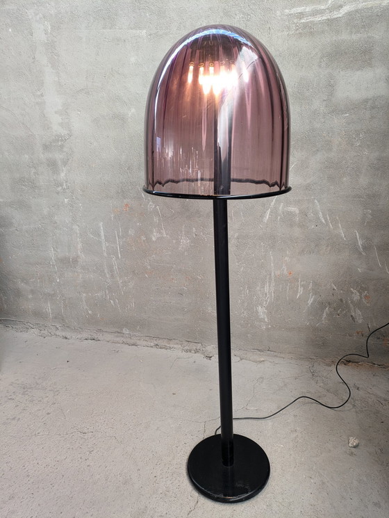 Charmante LEUCOS Carlotta Stehlampe aus lackiertem Metall und lila mundgeblasenem Glasschirm, um 1975.