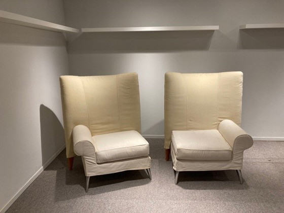 Zwei Sessel, die 1988 von Philippe Starck für die Hotellounge des kultigen Royalton Hotel New York entworfen und von Driade herausgegeben wurden. Die Lounge-Sessel zeichnen sich durch hohe Rückenlehnen aus. Der Stuhl hat Beine aus Holz und Stahl. Die Polsterung ist aus cremefarbener Baumwolle und Flanell.