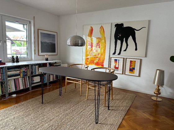 Dieser einzigartige Linoleum Tisch in Mauve ist ein echter Hingucker für dein Zuhause. Mit seiner eleganten, ovalen Form und den filigranen schwarzen Metallbeinen bringt er einen Hauch von Modernität in jeden Raum. Perfekt für das Esszimmer oder als stilvoller Arbeitsplatz im Homeoffice.