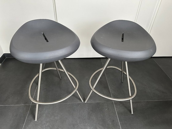 Die beiden grauen Hocker haben eine Sitzhöhe von 65 cm, die roten und schwarzen 80 cm. Die Höhe ist nicht verstellbar.