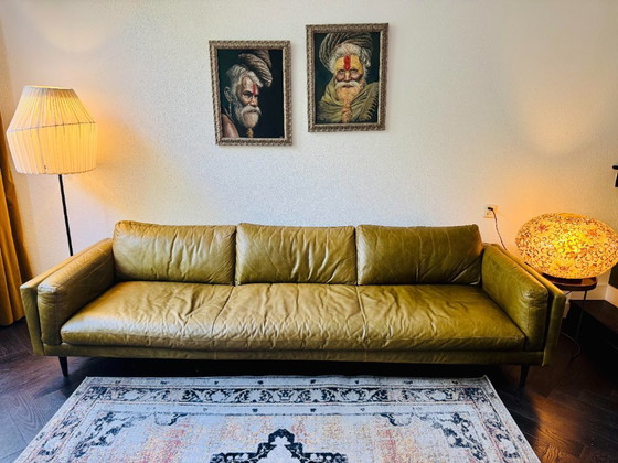 Das Side Sofa aus Leder hat dank seiner schmalen Armlehne mit breiten Kissen einen eleganten, robusten Look. Dadurch erhält das Sofa mehr Körper, ohne schwer zu wirken. Dieses Sofa wird in der Größe 4,5 Sitzer in der beliebten offenen Anilinlederart Massai in der Farbe Olive geliefert. Das natürliche Anilinleder wird im Fass durchgefärbt. Dies geschieht mit transparenten Anilinfarbstoffen. Die Oberfläche der Haut hat eine offene Struktur. Dadurch fühlt sich das Leder herrlich bequem und warm an. Technische Daten: Breite 285, Sitzbreite 243, Tiefe 94. Sockel aus verjüngtem Holz, 18 cm hoch. Gekauft bei Loods 5 in Ende 2020 für 3699 Euro. (Gutschein vorhanden) wird jetzt neu für 4549 Euro bei Loods 5 verkauft.