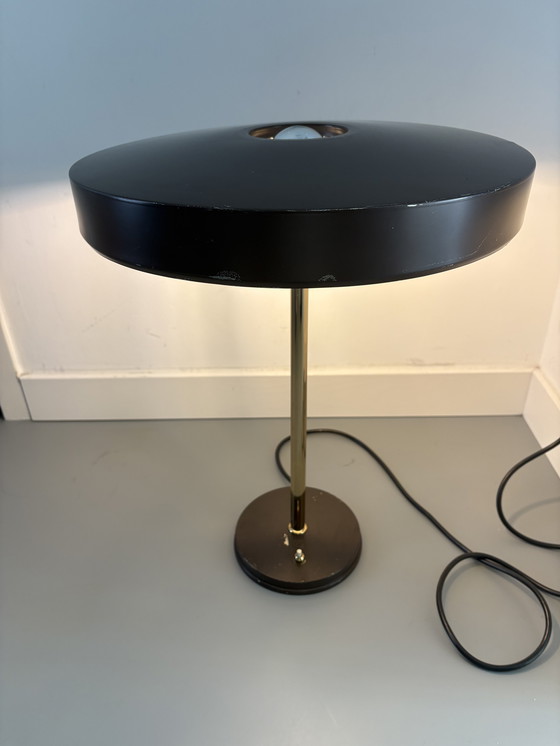 Die Timor 69, ein Designklassiker der Raumfahrtära, wurde von Louis Kalff für Philips entworfen. Die Lampe besticht durch ihren UFO-förmigen Schirm und Fuß aus braun lackiertem Aluminium sowie eine Messingstange. Sie wurde in den 1970er- und 1980er-Jahren produziert und ist 52 cm hoch. Der Schirm hat einen Durchmesser von 40 cm.