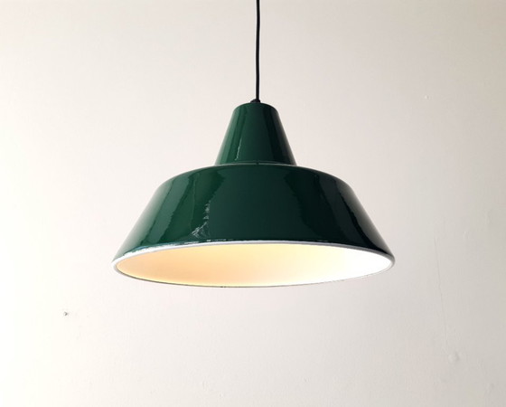Eine schöne, klassische, dunkelgrüne Emaille-Pendelleuchte aus den 1970er Jahren im Industrie-Look. Diese minimalistische, emaillierte Pendelleuchte wurde in den 1930er Jahren entworfen und in den 1970er Jahren von Louis Poulsen & Co. in Dänemark hergestellt. Die Außenseite ist grün emailliert und die Innenseite weiß. Diese zeitlose Vintage-Lampe wurde gereinigt und mit einem neuen schwarzen Kabel, einer E27-Fassung und einer Deckenrosette ausgestattet. Abmessungen: Höhe: 23 cm, Durchmesser: 35 cm. Die Lampe ist in gutem Vintage-Zustand, mit einigen kleinen Schäden am Rand des Schirms (siehe Foto 6).