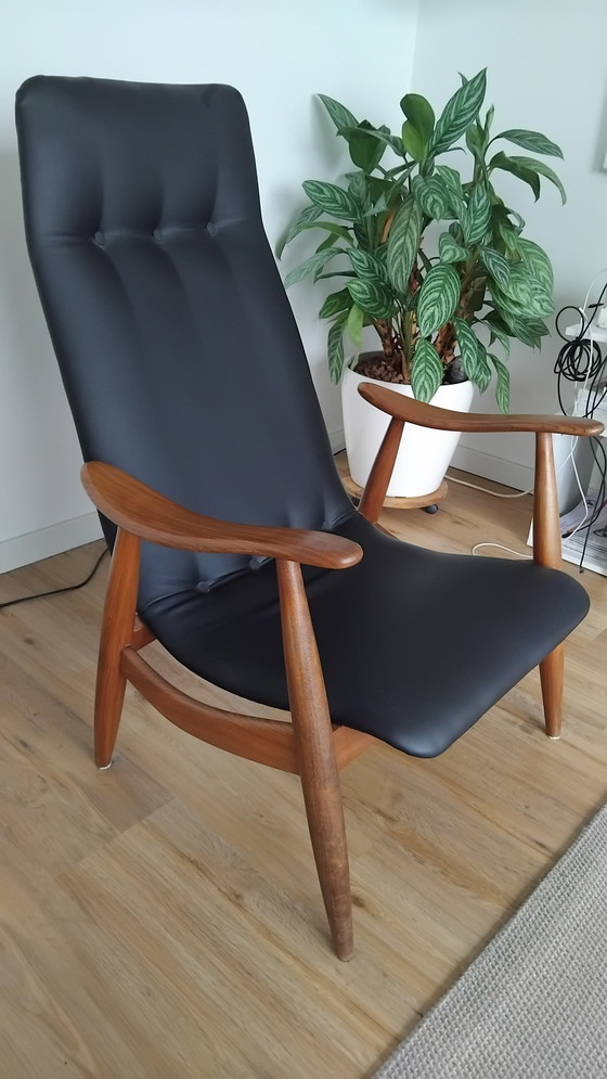 Louis Van Teffelen Sessel in schwarzem Skai, entworfen für Webe. Der Sitz ist aus einem Stück gebogenem Holz gefertigt. Der Zustand ist noch sehr gut mit minimalen Gebrauchsspuren, die Gelenke sind neu verleimt, die Polsterung wurde vor zwei Jahren komplett mit schwarzem Skai neu bezogen. Material: Eiche und Skaipolsterung. Holzfarbe und schwarz.