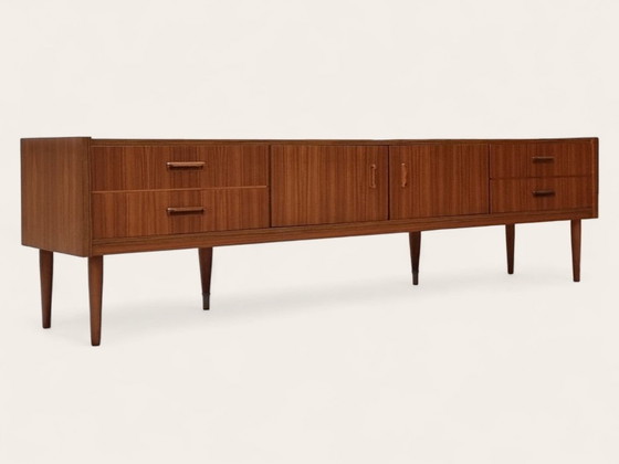 Wunderschönes Vintage-Lowboard aus den 1970er Jahren mit klarem skandinavischem Look dank seines eleganten Designs und des warmen Walnussfurniers. Das Lowboard steht auf eleganten, runden, konischen Holzbeinen, die ihm eine edle und luftige Optik verleihen.