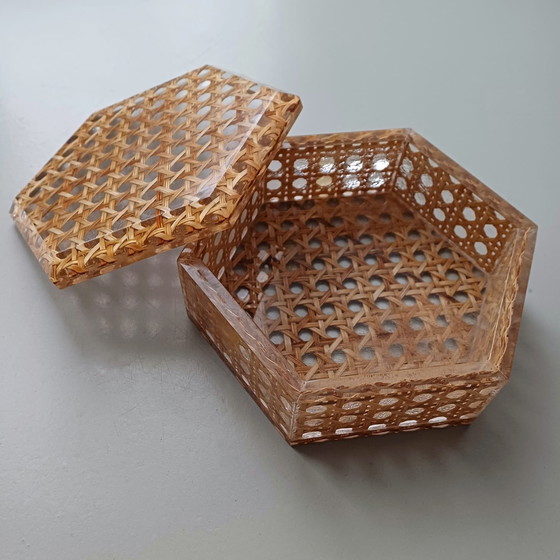 Diese sechseckige Box vereint die Eleganz von klarem Lucite mit dem natürlichen Charme von geflochtenem Rattan. Perfekt, um jedem Raum einen Hauch von Bohème zu verleihen, eignet sie sich ideal zur Aufbewahrung kleiner Gegenstände oder als dekoratives Element. Ihre robuste Konstruktion und das einzigartige Design machen sie zu einem unverwechselbaren und funktionalen Möbelstück.