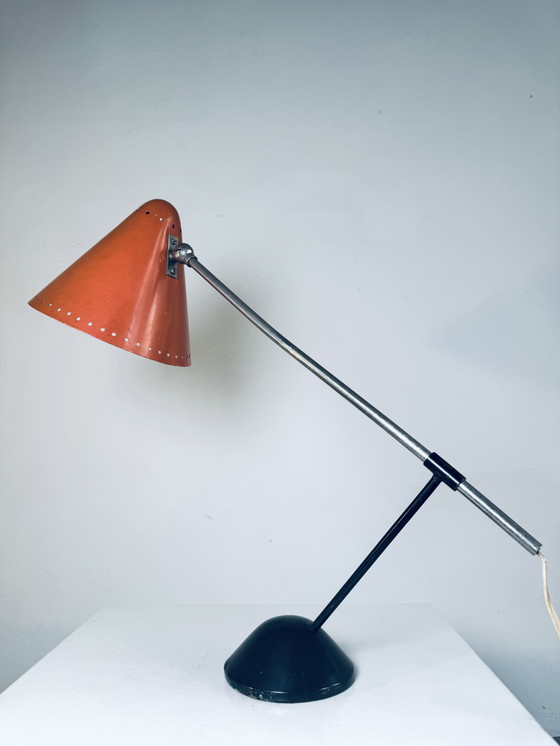 Diese seltene M1-Schreibtischlampe wurde um 1956 von Floris Fiedeldij für Artimeta Soest entworfen und ist ein Paradebeispiel für das niederländische Design der Jahrhundertmitte. Mit ihrem auffälligen roten Metallschirm, der teilweise perforiert ist, um ein sanftes, stimmungsvolles Licht zu erzeugen, verbindet die Leuchte Eleganz und Funktionalität in einer minimalistischen Silhouette.