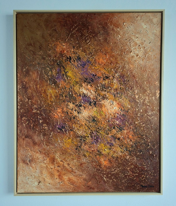 Entdecken Sie die faszinierende Welt von „Nebula II“ von Manou Claire. Dieses abstrakte Gemälde fängt die Essenz kosmischer Schönheit mit seinen satten Braun-, Violett-, Orange- und Gelbtönen ein. Perfekt für Liebhaber moderner Kunst, die ihrem Interieur einen Hauch von Geheimnis verleihen möchten. Lassen Sie Ihre Räume mit diesem einzigartigen Werk erstrahlen. Acryl auf Leinwand mit schlichtem Holzrahmen. Farben: verschiedene Braun-, Ocker-, Burgunder-, Orange-, Ecru-, Schwarz- und Bronzetöne. Maße: 100 x 80 cm. Rahmen: 104 x 84 cm. Mit Echtheitszertifikat und signiert von der Künstlerin.