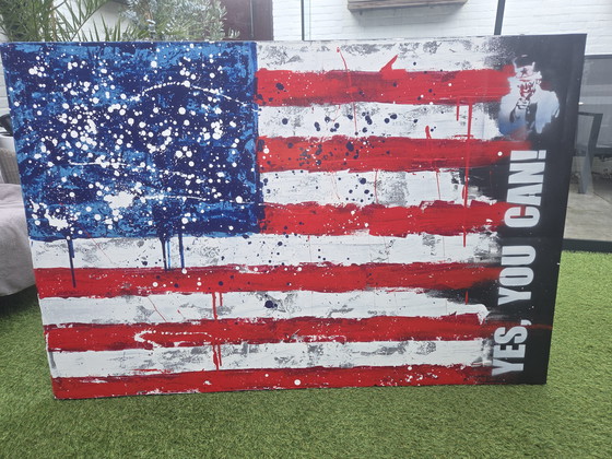 Dieses Gemälde von Marcel Labrie mit dem Titel „Yes You Can!“ ist ein ausdrucksstarkes und visuell beeindruckendes Kunstwerk, das die ikonische amerikanische Flagge modern und expressiv interpretiert. Die kräftigen Pinselstriche und Farbspritzer erzeugen eine dynamische Wirkung, die den Betrachter zum Verweilen einlädt.