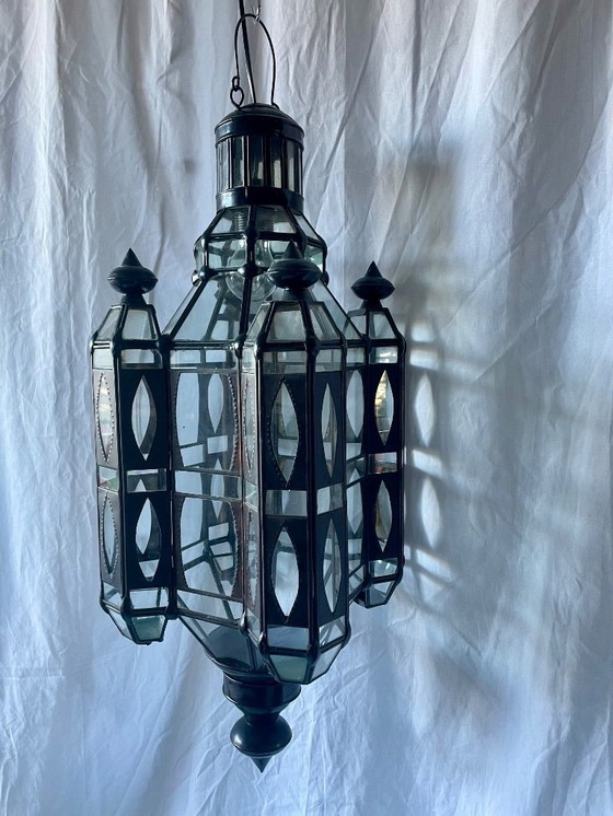 Dieser in Marokko handgefertigte Kronleuchter aus Glas und Metall mit verstärkter Oberfläche (70 cm hoch) verleiht Ihrem Interieur ein orientalisches, prunkvolles Flair. Der Metallrahmen weist leichte Dellen auf, und eine Glasscheibe hat im oberen Bereich einen kaum sichtbaren Riss. Kein Versand; nur Abholung oder Lieferung vor Ort.