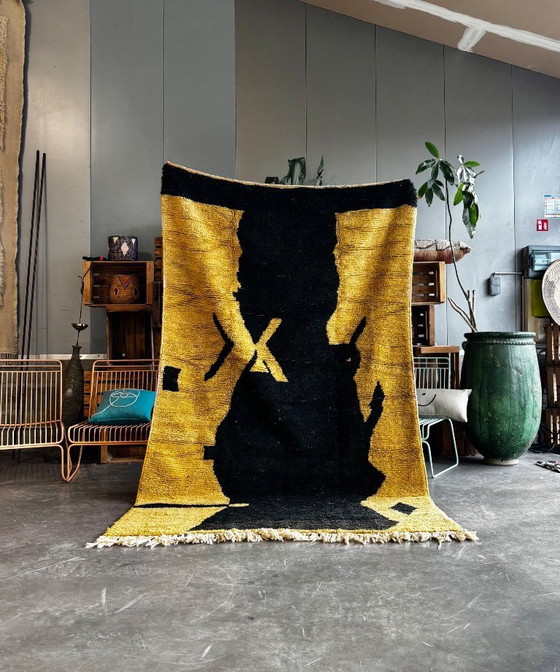 Dieser Teppich besticht durch eine kraftvolle grafische Komposition in tiefen Schwarz- und Senfgelbtönen. Das abstrakte zentrale Motiv und die asymmetrischen Farbblöcke verleihen ihm eine architektonische, fast skulpturale Präsenz. Sein starker Kontrast macht ihn zu einem echten Blickfang und ideal für designorientierte Interieurs. Handgewebt von erfahrenen marokkanischen Kunsthandwerkern, vereint dieser Teppich Authentizität, Langlebigkeit und künstlerischen Ausdruck. Der dichte, weiche und angenehme Wollflor bietet sowohl optische Wirkung als auch Komfort im Alltag.