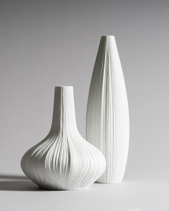 Das hier angebotene **Raritäten-Duo** besteht aus zwei Vasen mit einer Höhe von **26 cm** bzw. **21 cm**, beide in der für Rosenthal typischen mattweißen Biskuitlackierung. Jedes Stück ist eine Studie des skulpturalen Rhythmus, wobei die vertikale Riffelung ein optisches Spiel erzeugt, das an die Op Art Bewegung erinnert. Die größere Vase mit ihrem schlanken Profil bietet vertikale Eleganz; das kürzere Pendant gleicht diese mit breiteren Proportionen aus und schafft so einen harmonischen visuellen Dialog.
