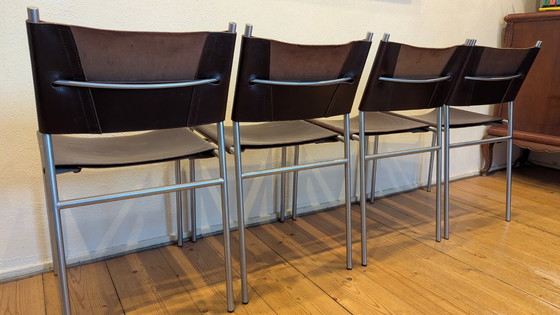 Die Stühle sind aus wunderschönem und strapazierfähigem, dunkelbraunem Sattelleder gefertigt, dessen charakteristische Patina den Charme des Alters unterstreicht.