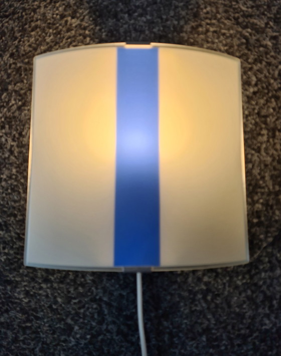 Massive belgische Glaswandleuchte. Die Wandleuchte hat eine mattierte, gebogene Glasplatte mit einer blauen Schiene in der Mitte. Die Glasplatte ist splitter- und kratzfrei. Der Schalter funktioniert einwandfrei. Die Lampe hat eine große Fassung. Maße: Höhe 25 cm, Breite 29 cm und Tiefe 9 cm.