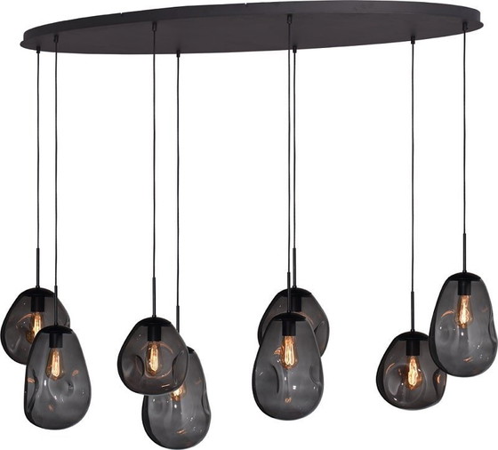 Produktinformation: Ausstellungsstück bei TMC Goes. Diese 8-flammige Masterlight-Leuchte aus der Lava-Kollektion besticht durch ihr elegantes Design, und das Rauchglas macht jede Leuchte zu einem Unikat. Die in Italien mundgeblasenen Glühbirnen verleihen jeder einzelnen ihre individuelle Form und ein charakteristisches Merkmal, wie beispielsweise eine kleine Vertiefung im Glas. Die Glühbirnen hängen an einer 160 cm breiten, schwarzen Montageplatte. Die Kabel haben eine maximale Länge von 150 cm, wodurch sich die Leuchte auch für hohe Decken eignet. Sie verfügt über eine E27-Fassung. Bitte beachten Sie: Die Leuchte wird ohne Glühbirnen und Dimmer geliefert.