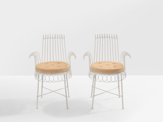 Dieses ikonische Sesselpaar von Cap d'Ail ist eine Originalkreation von Mathieu Matégot aus den 1950er Jahren. Die Sessel sind aus weiß lackiertem Metall gefertigt. Die sorgfältige Verarbeitung des Rohmaterials zeugt vom Einfallsreichtum des Künstlers. Matégots komplizierte, ineinander verschlungene Muster und Kurven verleihen jedem von ihm entworfenen Stück einen Hauch von Raffinesse und verkörpern eine perfekte Mischung aus Eleganz und dem für die Nachkriegszeit typischen skurrilen Flair. Diese beiden Stühle wurden in unserer Werkstatt komplett restauriert und die Sitzkissen mit einem pastellgelben Stoff von Pierre Frey bezogen, der sowohl für den Innen- als auch für den Außenbereich geeignet ist.