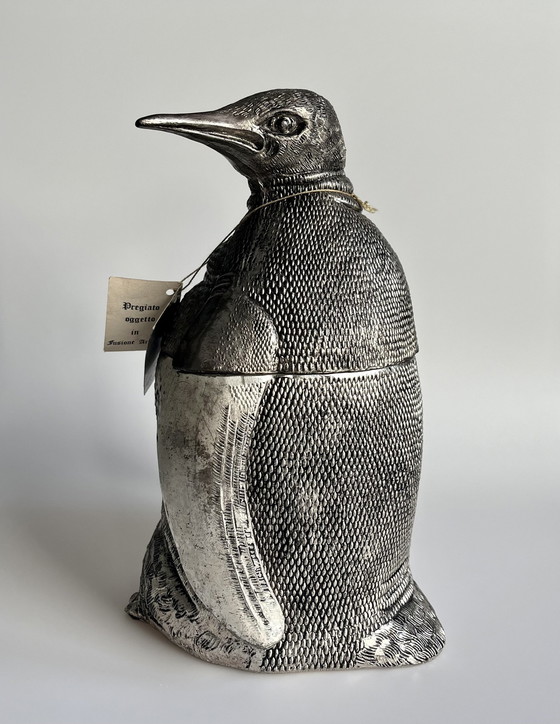 Sehr schöner Vintage-Eiskübel in Form eines Pinguins, entworfen vom italienischen Künstler Mauro Manneti, der auch für den Ananas-Eiskübel bekannt ist. Der Pinguin ist ein seltenes Design und stammt aus dem Jahr 1970. Signiert mit MM für Mauro Manetti, Firenze (Florenz), Seriennummer und inkl. Garantiekarte (!). Höhe: 26 cm Durchmesser: 12 cm
