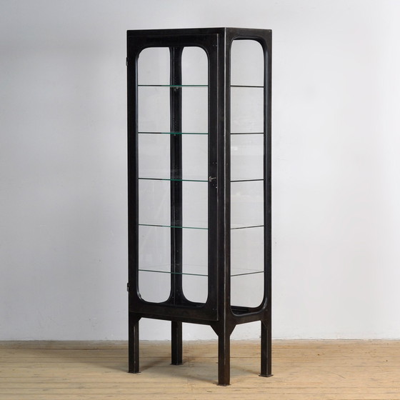 Hergestellt aus Stahl und Glas, das durch einen Gummistreifen in den Stahl geklemmt wird. Die Vitrine ist aus den 1970er Jahren und wurde in Ungarn hergestellt. Die Vitrine wurde bis auf das Metall entlackt und mit einem transparenten Lack überzogen. Mit 5 Glasböden (verstellbar). Diese Vitrine hat Glas auf allen vier Seiten.