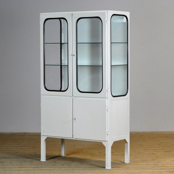 Dieser medizinische Schrank wurde in den 1970er Jahren entworfen und um 1975 in Ungarn hergestellt. Er besteht aus Eisen und Glas mit neuen Glasböden. Das Glas wird von einem schwarzen Gummistreifen gehalten. Der Schrank ist mit zwei verstellbaren Glasböden und funktionierenden Schlössern ausgestattet.
