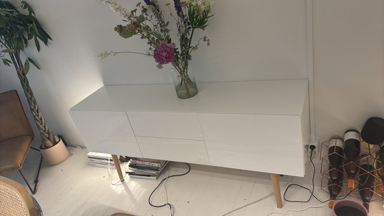 Dieses ZUIVER-Sideboard ist ein stilvolles und funktionelles Möbelstück mit einer Breite von 1,60 m, einer Tiefe von 41 cm und einer Höhe von 72 cm. Es hat eine weiße Hochglanzoberfläche und Holzbeine, die jedem Raum einen modernen Touch verleihen. Das Sideboard verfügt über zwei Schränke und drei Schubladen mit Soft-Close-Funktion, die reichlich Stauraum bieten. Trotz einiger kleiner Kratzer und einer Schranktür, die angepasst werden muss, bleibt es eine schöne und praktische Ergänzung für Ihr Zuhause.