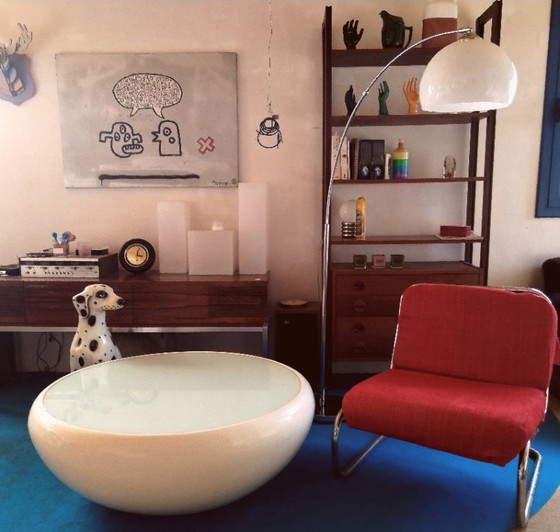 Betreten Sie die Zukunft mit diesem faszinierenden Couchtisch im Space-Age-Design – die perfekte Verbindung von Form und Funktion. Sein schlankes, abgerundetes Design und die glänzende weiße Oberfläche machen ihn zum Blickfang in jedem modernen Wohnraum.