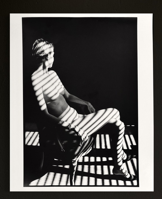 Dies ist eine beeindruckende Schwarz-Weiß-Fotografie von Michel Pinel mit dem Titel "Femme zébrée". Das Bild misst 50 cm x 40 cm und zeigt eine Frau in eleganter Pose mit zebraähnlichen Schatten, die über ihren Körper geworfen werden und einen fesselnden visuellen Effekt erzeugen. Die Fotografie ist auf Barytpapier gedruckt, das für seine hohe Qualität und Haltbarkeit bekannt ist, und wurde im Atelier des Künstlers angefertigt. Dieses Werk ist perfekt für Kunstliebhaber, die ihrer Sammlung einen modernen und anspruchsvollen Touch verleihen möchten.