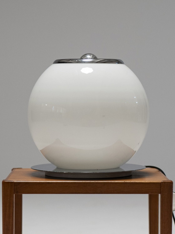 Für ihren nächsten Zaubertrick setzten Giuliana Gramigna und Sergio Mazza eine große, beleuchtete Opalinenkugel auf eine Chromscheibe, versenkten eine verchromte Halbkugel in deren Spitze, schraubten eine weitere Glühbirne hinein und fertig ist Micol - eines der besten Beleuchtungsdesigns des Space Age. Die in den 70er Jahren von Quattrifolio hergestellte Tischleuchte funktioniert noch immer einwandfrei. Dank eines Schalters mit zwei Knöpfen können die Glühbirnen im Inneren der Opalinenkugel und die Glühbirne auf der Oberseite unabhängig voneinander betrieben werden.