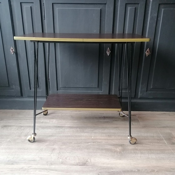 Einzigartig! Dieser besondere Trolley/Getränketisch auf schönen Laufrädern ist einfach ein bisschen anders. Ausgestattet mit einer zweiten Etage. Ideal als Beistelltisch oder als Trolley, um schöne Getränkeflaschen zu präsentieren. Ein echter 60er/70er Jahre Look. Wahrscheinlich in Holland in den 1960er Jahren hergestellt. Ausgestattet mit Rollen, die das Aufstellen erleichtern. Dieser Wagen ist in gutem Vintage-Zustand. Retro und trendy. Prost!