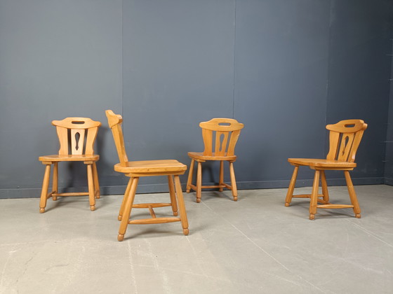 Rustikale Esszimmerstühle aus massiver Eiche mit schön gearbeiteten Rückenlehnen und klobigen Beinen.