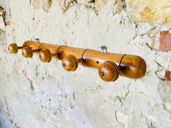 Dieser Garderobenständer aus Frankreich ist aus gedrechseltem Holz gefertigt und von Hand geschnitzt. Er hat einen tollen Bambusimitat-Effekt und 5 Haken. Diese Art von Garderobenständern war in den 30er und 40er Jahren in französischen Bistros üblich.
