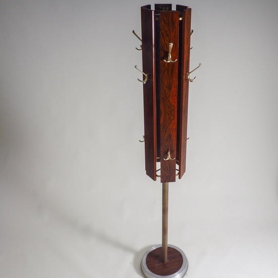 Stilvoller Kleiderbügel aus der Mitte des Jahrhunderts aus warmem Palisanderholz mit verchromter Stange. Er bietet 9 Haken (zwei verschiedene Designs) zum Aufhängen von Gegenständen. In sehr gutem Vintage-Zustand, obwohl die Chromstange einige Alterserscheinungen und leichte Verfärbungen aufweist. Ein funktionelles und elegantes Stück für jeden Eingangsbereich.